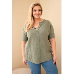 Dámske Plus veľkosť bavlnená blúzka s gombíkom výstrihom Khaki