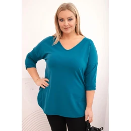 Dámská bavlněná košile Plus Size s výstřihem do V a ohrnutými rukávy mořská