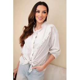 Košile vyniká efektním krajkovým dílem ve tvaru V a jemným volánkem u výstřihu, což jí dodává ženský charakter. Další předností je zavazování vpředu, které umožňuje přizpůsobit střih postavě a vytvořit módní outfit. Rukávy končí jemným řasením, které podtrhuje lehkost celého modelu. Ideální k džínům, látkovým kalhotám nebo sukni.