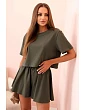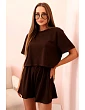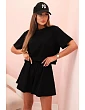 - Strih: voľné tričko a široké šortky s elastickým pásom
