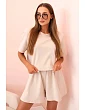 Hľadáte pohodlný a štýlový komplet na teplejšie dni? Tento dámsky teplákový úbor s krátkym rukávom a širokými šortkami je skvelou voľbou na každodenné výlety, relax doma alebo dovolenkové prechádzky. Je vyrobený z mäkkej, elastickej bavlny s prídavkom elastanu, čo zaručuje celodenné pohodlie. Voľné tričko s okrúhlym výstrihom sa dokonale prispôsobí postave a elastické šortky v páse zaručujú voľnosť pohybu. Vďaka univerzálnemu strihu možno tento komplet nosiť v mnohých štýloch - obujte si ho s teniskami, papučami alebo módnymi sandálmi a užite si maximálne pohodlie. Veľkosť je univerzálna a bude vyhovovať ženám, ktoré nosia veľkosť S, M alebo L.