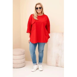 Dámská blůza Plus Size s bavlnou, kapsou a ohrnutým rukávem červená