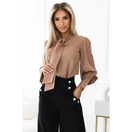 Dámska blúzka 578-1 NUMOCO - svetlohnedá farba - vyrobená z kvalitného materiálu s jemným strieborným vzorom - dlhé voľné rukávy - zakončená širokými manžetami so štyrmi gombíkmi - štýlová mašľa pod krkom