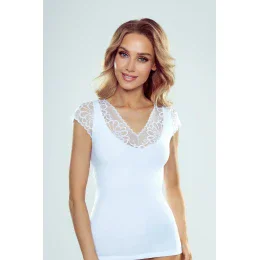 Výstrih v tvare písmena "V" je obšitý efektnou čipkou, rovnako ako rukávy. Zadný diel modelu je hladký.