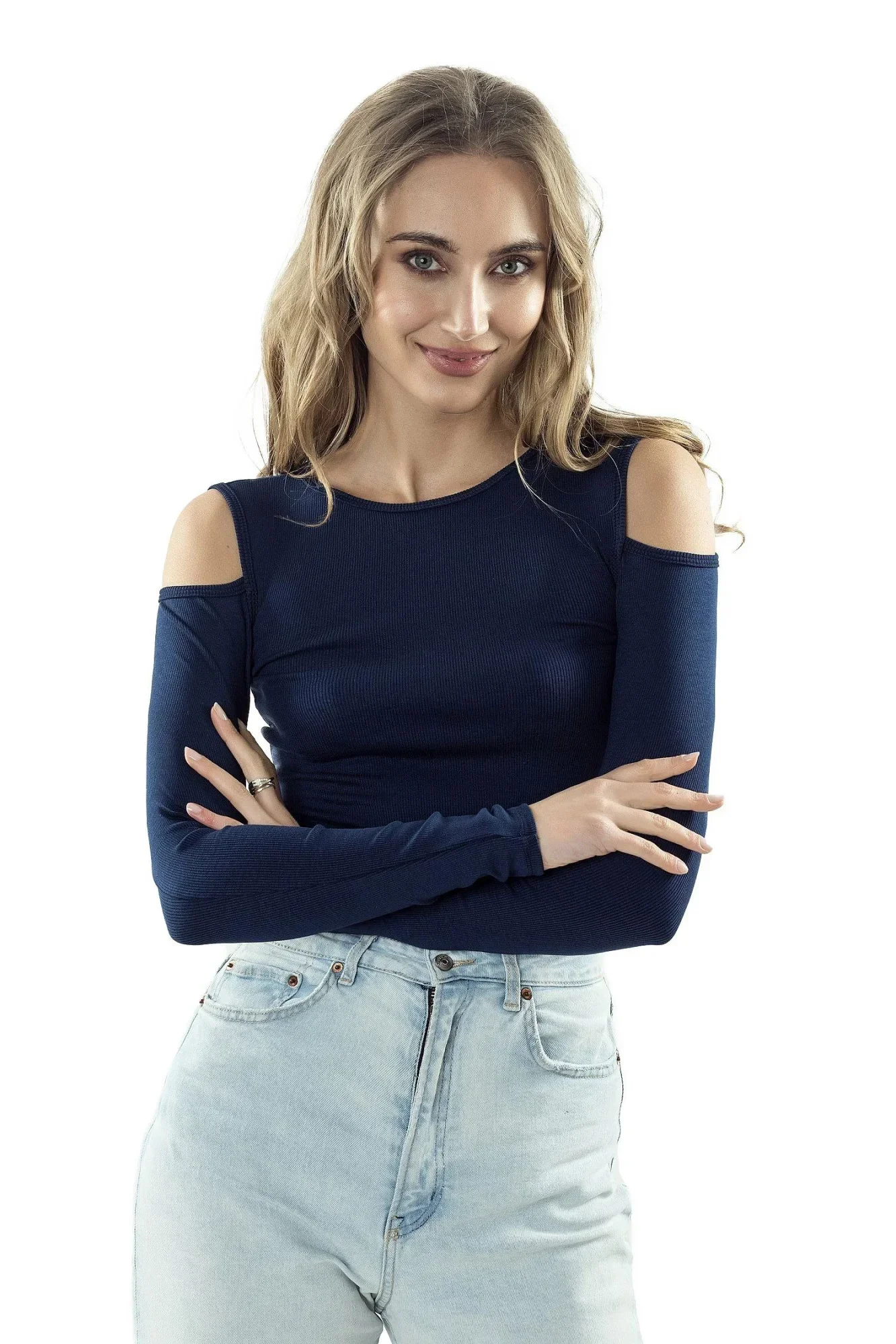 Dámska blúzka Liv dark blue ELDAR - tmavomodrá farba - vyrobená z kvalitnej pruhovanej viskózy - dlhé rukávy - odhalené ramená Zloženie materiálu: 95% viskóza + 5% elastan