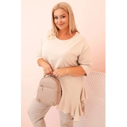 Tento dámsky plus size top s bavlnou je výnimočný model, ktorý spája pohodlie s módnym, ženským nádychom. Je vyrobený z mäkkého a elastického bavlneného úpletu, ktorý zaručuje celodenné pohodlie pri nosení. Voľný strih sa nelepí na postavu a ozdobný volánik na spodnom okraji dodáva topu ľahkosť a charakter.