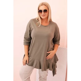 Tento dámsky plus size top s bavlnou je výnimočný model, ktorý spája pohodlie s módnym, ženským nádychom. Je vyrobený z mäkkého a elastického bavlneného úpletu, ktorý zaručuje celodenné pohodlie pri nosení. Voľný strih sa nelepí na postavu a ozdobný volánik na spodnom okraji dodáva topu ľahkosť a charakter.