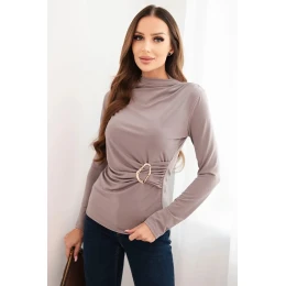 Táto elegantná dámska blúzka s prídavkom viskózy je vynikajúcou voľbou pre ženy, ktoré ocenia pohodlie a štýlové detaily. Model má na boku jemné nariasenie zvýraznené efektnou zlatou sponou, ktorá krásne modeluje pás a dodáva postave ženský tvar. Dlhé rukávy a vyšší výstrih zaručujú, že blúzka pôsobí veľmi elegantne.