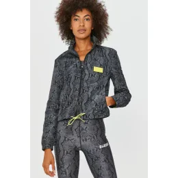 Štýlová dámska bunda v sivo-čiernom hadom dizajne. Detaily bundy (logo Guess a šnúrka na stiahnutie) sú vyhotovené vo výraznej fosforeskujúcej farbe, ktorá dopĺňa celkový dizajn bundy.