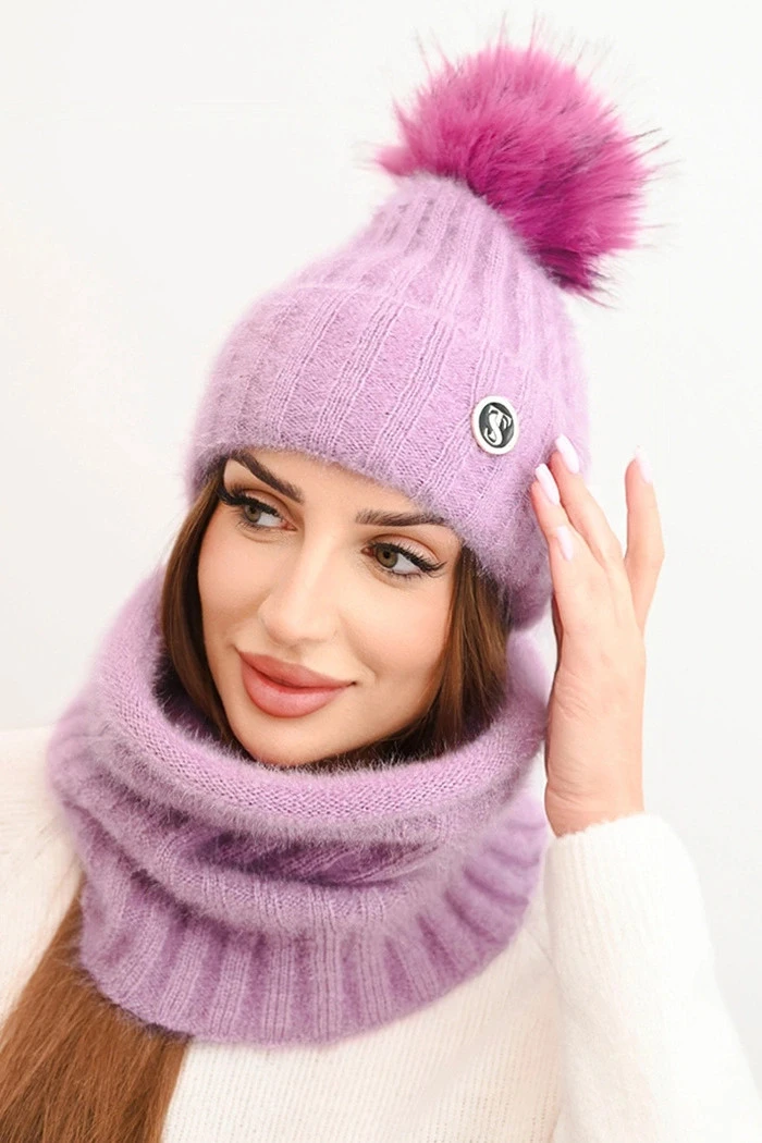 Štýlová a praktická zimná súprava pre ženy - čiapka s efektnou veľkou bambulou a mäkký nákrčník. Vyrobená z na dotyk jemného, nadýchaného úpletu s jemným leskom. Zabezpečuje tepelný komfort a módny vzhľad počas chladných dní.