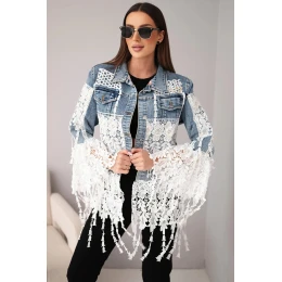 Táto výnimočná dámska džínsová bunda je dokonalým spojením klasickej džínsoviny a ženského pôvabu. Zdobia ju široké pruhy bielej čipky so vzorom, priťahuje pohľady a vynikne v každom outfite. Bohato zdobené rukávy a spodná časť bundy dodávajú celku romantický boho charakter. Jemné zakončenie dodáva bunde ľahkosť a jemnosť.
