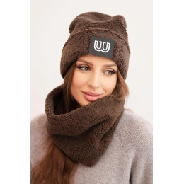 Dámska fleecová čiapka a nákrčník s ozdobnou aplikáciou hnedej farby