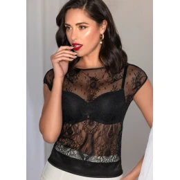 Objavte nadčasovú eleganciu a ženskosť s čipkovanou blúzkou Leilieve, dokonalým kúskom, ktorý dodá šarm každému outfitu. Blúzka z jemnej čipky prináša ľahkosť a rafinovanosť, zatiaľ čo elastické a príjemné zloženie materiálu zaručuje pohodlné nosenie počas celého dňa. Elegantný strih lichotí siluete a zdôrazňuje ženské krivky. Blúzka má vďaka čipke romantický a jemný vzhľad, ideálny na kombinovanie s elegantnými nohavicami, sukňami alebo pod sakom. V spodnej časti je všitý vyšší lesklý saténový elastický lem.