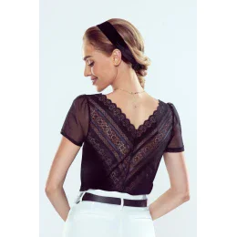 Halenka je vyrobená z viskózy příjemné na dotyk. Přední i zadní díl modelu zdobí výstřih v tvaru písmene "V" z ažurové krajky. Halenka má nadýchané tylové rukávy.
