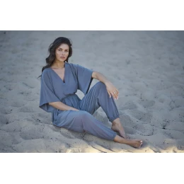 Elegantní dámský overal. Volný rukáv sahající až k loketnímu záhybu zajišťuje volnost pohybu. Kombinéza je mimořádně smyslná díky výstřihu do V, který nejen zvýrazňuje poprsí, ale také opticky prodlužuje krk. Dlouhé nohavice s praktickou manžetou dodávají obleku styl a díky nim vypadá skvěle s různou obuví.