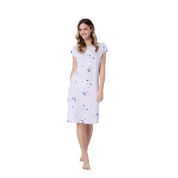 Košeľa Karina 1736 značky Leveza je kombináciou pohodlia, ženského štýlu a prírodných materiálov. Je vyrobená zo 100 % kvalitnej bavlny, je mäkká, priedušná a príjemná na pokožku, čo zaručuje pohodlie počas celej noci. Model s krátkymi rukávmi a ľahkým lodičkovým výstrihom pôsobí jemne a elegantne. Kvetinový vzor v módnom odtieni atramentovej modrej dodáva košeli svieži, ženský charakter. Dĺžka po kolená a praktický dlhý bočný rozparok zvyšujú voľnosť pohybu a pohodlie pri používaní. Je to ideálna nočná košeľa na jarno-letné obdobie, vhodná aj ako pohodlný domáci odev.
