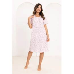 Wygodna koszula nocna damska o klasycznym, luźnym kroju, idealna dla kobiet ceniących komfort i swobodę. Jasna kolorystyka z subtelnym, drobnym motywem kwiatowym nadaje całości lekkości i ponadczasowej elegancji. Krótki rękaw oraz długość do kolan sprawiają, że koszula doskonale sprawdzi się zarówno latem, jak i przez cały rok. Delikatne marszczenie pod biustem zapewnia wygodne dopasowanie i nie krępuje ruchów, gwarantując komfort podczas snu i domowego wypoczynku.