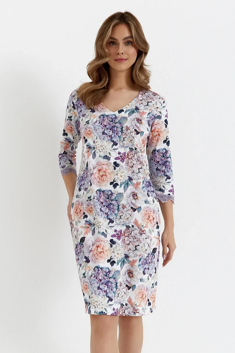 Rękaw 3/4 ozdobiony miękką, liliową koronką dodaje subtelności i lekkości całej stylizacji. Trójkątny, odszywany dekolt delikatnie eksponuje szyję, a długość do kolan sprawia, że koszula jest idealna zarówno na co dzień, jak i na wyjątkowe okazje. Poczuj się stylowo i wygodnie w każdej sytuacji!