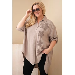 Zvláštnosťou tejto košele sú efektné kvetinové aplikácie, ktoré celku dodávajú originalitu a ženský šarm. 3/4 dlhé rukávy s možnosťou zastrčenia a vyhrnutia robia model mimoriadne praktickým a univerzálnym. Dlhší zadný diel jemne predlžuje siluetu a umožňuje nosiť košeľu ako zvonka, tak aj zastrčenú do nohavíc alebo sukní.