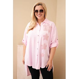 Zvláštnosťou tejto košele sú efektné kvetinové aplikácie, ktoré celku dodávajú originalitu a ženský šarm. 3/4 dlhé rukávy s možnosťou zastrčenia a vyhrnutia robia model mimoriadne praktickým a univerzálnym. Dlhší zadný diel jemne predlžuje siluetu a umožňuje nosiť košeľu ako zvonka, tak aj zastrčenú do nohavíc alebo sukní.