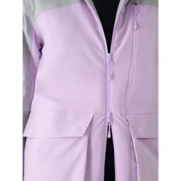 Damska kurtka narciarska z membraną jest wyposażona w zintegrowany kaptur z profilowanym daszkiem oraz regulacją głębokości. Szyję osłania wysoki kołnierz, który dodatkowo zabezpieczy przed chłodem i wiatrem. Rękawy zakończone są mankietami z regulacją na rzep. Pod pachami umieszczono wentylację zapinaną na jednokierunkowy zamek kryty pod plisą, który daje możliwość regulacji przepływu powietrza.Kurtka na narty damska jest zapinana na dwukierunkowy zamek główny z wewnętrzną plisą przeciwwiatrową, która ogranicza przenikanie chłodu do wnętrza kurtki. Obwód dołu można wyregulować przy użyciu tunelowego ściągacza ze stoperami. Całości dopełnia zintegrowany pas śnieżny z regulacją obwodu za pomocą nap, który zabezpiecza przed przedostawaniem się śniegu do wnętrza.