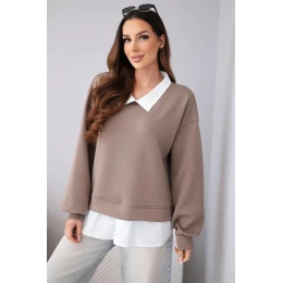 Stylová dámská mikina s nápadným vložením ve stylu košile je ideální kombinací elegance a pohodlí. Model kombinuje klasický střih mikiny s přišitým spodním dílem napodobujícím košili a límečkem, což vytváří módní vrstvený efekt bez nutnosti nosit dva samostatné kusy oblečení.