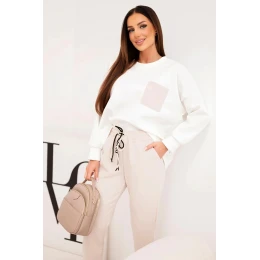 Táto štýlová a pohodlná dámska tepláková súprava je ideálnou ponukou pre ženy, ktoré oceňujú pohodlie a módny vzhľad. Mikina z mäkkého, voľného materiálu bola obohatená o kontrastné vrecko s roztomilým akcentom v tvare srdca, ktoré celku dodáva ženský šarm. Nohavice s elastickým pásom a šnúrkami na stiahnutie zaručujú dokonalé prispôsobenie sa postave a úplnú voľnosť pohybu.