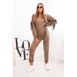 Táto elegantná dámska súprava v maslovej farbe je kombináciou pohodlia a módneho dizajnu. Voľnú mikinu zdobia efektné strapce na rukávoch, ktoré jej dodávajú výnimočný charakter. Je vyrobená z príjemného na dotyk elastického úpletu, ktorý zaručuje voľnosť pohybu a pohodlie pri nosení. Nohavice s elastickým pásom a reguláciou na šnúrku zaručujú dokonalé prispôsobenie a ich jednoduchý strih dokonale ladí s mikinou. Táto súprava je vhodná na každodenný styling aj na stretnutia s priateľmi.