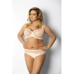 Košíčky podprsenky jsou vyrobené z jemné puntíkované krajky a jejich horní linii tvoří síťovina, která je ozdobená efektní výšivkou. Boky jsou zesílené svislými kosticemi. Ramínka tohoto modelu není možné odepnout.