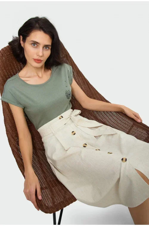 Elegantná sukňa s vysokým pásom. Dĺžka pod kolená. Zapínanie na gombíky po celej dĺžke vpredu. Pripojený opasok v páse, ktorý zvýrazňuje postavu. Ležérny strih. Vyrobené z tkaniny príjemnej na dotyk. Modelka na fotografii meria 179 cm a nosí veľkosť 36.