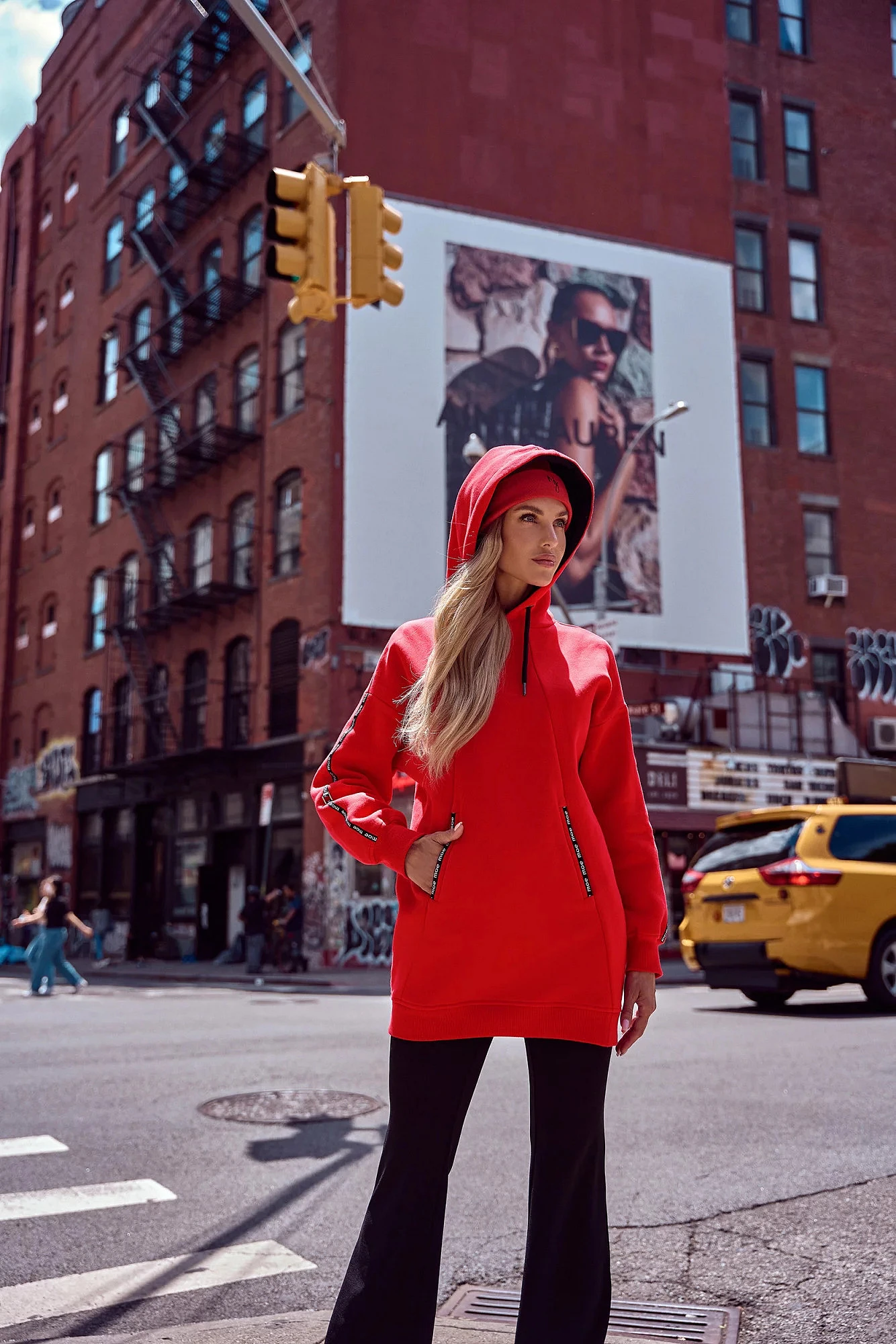 Milujeme tuniky, pretože sú také univerzálne. Náš sveter s kapucňou s ozdobnými pruhmi s logom a prednými vreckami sa bude skvele hodiť k legínam alebo džínsom. Je to nielen hrejivý a pohodlný kúsok, ale aj moderný dizajn, ktorý si radi vystajlujete podľa svojich predstáv.