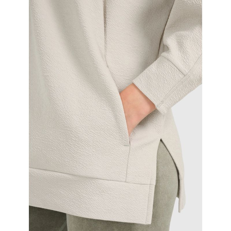 Luźna bluza damska 4F zapewnia wyjątkowy komfort na co dzień i podczas lekkiej aktywności. Miękka dzianina interlock z bawełnianą bazą jest przyjemna w dotyku i elastyczna, a oversizowy krój daje pełną swobodę ruchów. Technologia 4FDry wspiera szybkie odprowadzanie wilgoci, dzięki czemu zachowujesz suchość i świeżość. Stonowana kolorystyka, półgolf, kieszeń kangurka i boczne rozcięcia nadają bluzie nowoczesny, minimalistyczny charakter, tworząc model idealny do jogi, pilatesu, spacerów i codziennych stylizacji.