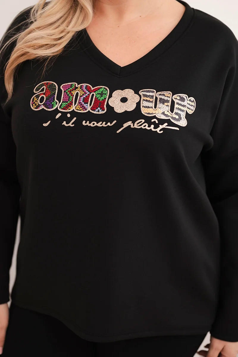 Dámská mikina Plus Size s nápisem a výstřihem do V černá