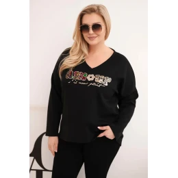 Táto dámska mikina plus size je dokonalou kombináciou pohodlia, štýlu a ženského akcentu. Je vyrobená z mäkkej, na dotyk príjemnej zmesi viskózy a polyesteru a zaručuje celodenné pohodlie pri nosení. Model má voľný strih s výstrihom do V, ktorý opticky zoštíhľuje postavu, a ozdobný nápis s lesklými detailmi, ktorý dodáva módny charakter. Dlhší zadný diel dokonale zakrýva boky a robí z mikiny skvelú voľbu k legínam, džínsom alebo úzkym nohaviciam. Ideálna voľba na každý deň, do práce, na prechádzku alebo na neformálne stretnutie s priateľmi.