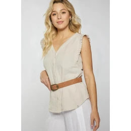 Dámská mušelínová halenka z měkké bavlněné tkaniny. Halenka visela na širokých ramínkách s volánky a výstřihem do V. Halenka se zapíná na knoflíky. Tento model bude skvěle fungovat téměř v jakékoli stylizaci. Modelka na obrázku je 177 cm vysoká a má velikost 36.