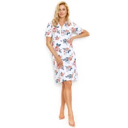 Dámska nočná košeľa 2880 Scarlett TARO - biela - vyrobená z kvalitnej bavlny - krátke rukávy - s modrým a červeným vzorom - zapínanie na gombíky - dĺžka po kolená