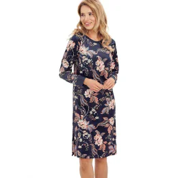 Nočná košeľa 3060 Venus TARO - tmavomodrá - z kvalitného velúru - s dlhými rukávmi - zdobená kvetinovou potlačou Zloženie materiálu: 94% polyester + 6% elastan