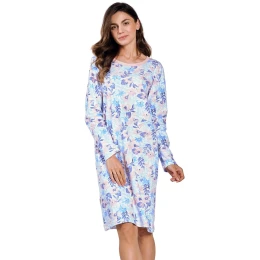 Dámska nočná košeľa 3238 Ginny TARO - svetlomodrá - z kvalitnej bavlny interlook - s kvetinovým vzorom - dlhé rukávy