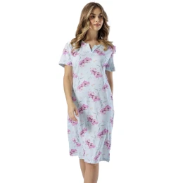 Dámske tričko s krátkym rukávom z mäkkej bavlny s kvetinovou potlačou, okrúhly výstrih s kontrastným zadným dielom v tvare V, dĺžka po kolená.