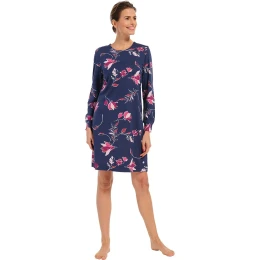 Táto módna nočná košeľa upúta pozornosť bielo-fuchsiovým kvetinovým vzorom na tmavo modrom pozadí. Módne prevedenie s okrúhlym výstrihom a dlhými rukávmi. V modeli vyrobenom z vysoko kvalitnej bavlny a modalu sa budete cítiť jednoducho dobre. Materiál zaujme aj svojimi žiarivými farbami.