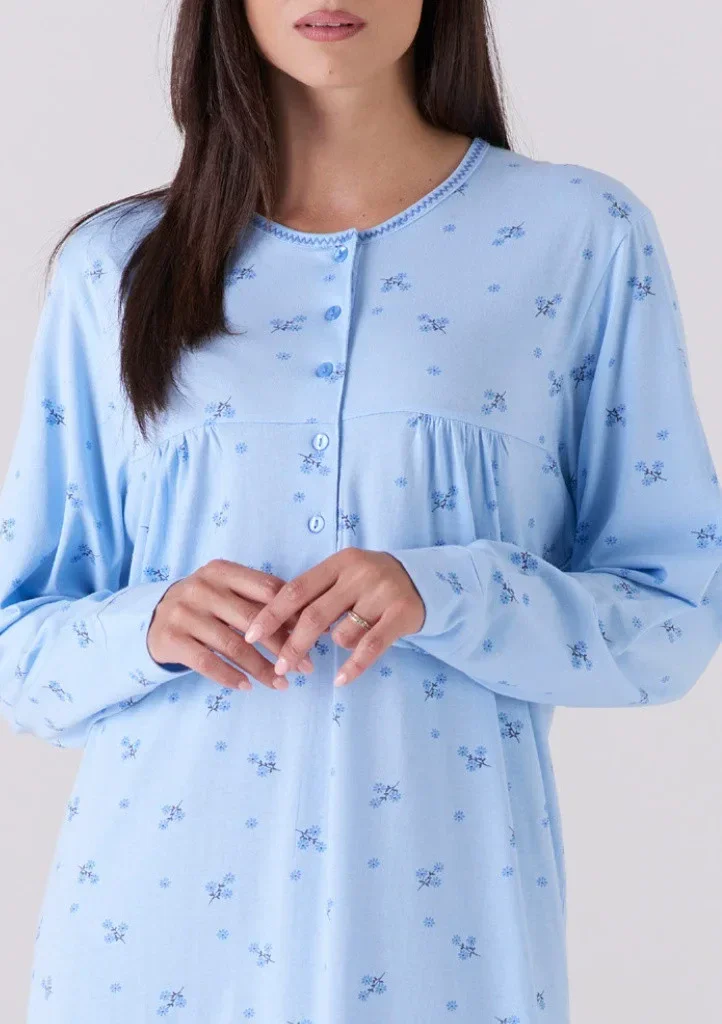 Táto dámska nočná košeľa od talianskej značky Karelpiu má dlhý rukáv so širokou manžetou na gombíky a dĺžku pod kolená. Okrúhly výstrih má zapínanie na 5 gombíkov. Košeľa je v oblasti hrudníka prestrihnutá a je mierne nariasená. Nočná košeľa je vyrobená z bavlneného džersejového materiálu, ktorý sa vyznačuje vysokou priedušnosťou, savosťou a je veľmi príjemný na dotyk. Budete sa v nej cítiť veľmi pohodlne aj v letných mesiacoch. Materiálové zloženie: 100% bavlna.