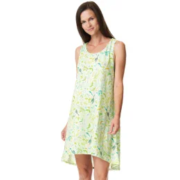 Pohodlná bavlněná noční košile. Ležérní a ženský áčkový tvar s prodlouženou zadní částí. Zelená barva s motivem zahradních bylinó³.