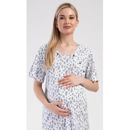 Dámska bavlnená tehotenská nočná košeľa Flowers. Strih nočnej košele je určený na tehotenstvo, materstvo a dojčenie. Na dojčenie sú na bokoch košele rozparky, ktoré sa zapínajú na gombíky. Košeľa je potlačená drobnými modrými kvetmi. Použitý materiál je zo 100 % bavlny a je príjemný a pružný na dotyk.