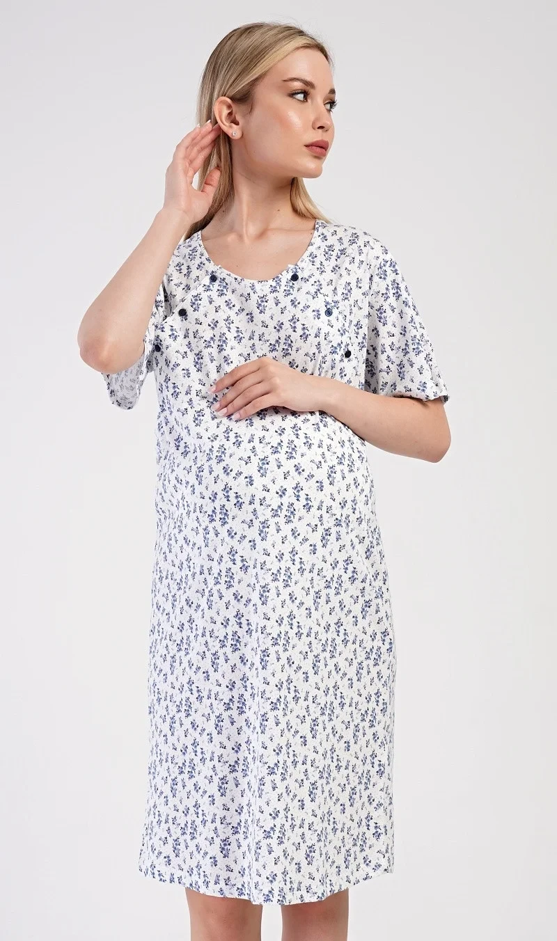 Dámská bavlněná mateřská noční košile Flowers. Noční košile je svým střihem určená na dobu těhotenství, do porodnice i ke kojení. Ke kojení slouží průstřihy po stranách košile, které jsou uzavíratelné na knoflíky. Košile je potištěna drobnými modrými květy. Použitý materiál s podílem bavlny 100% je příjemný a poddajný na dotek.