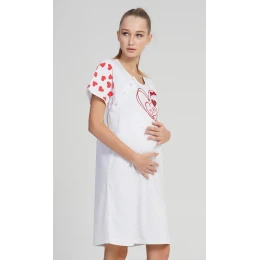 Dámská noční košile mateřská Love. Dámská mateřská košilka je svým sřihem ručená na dobu těhotenství, do porodnice i ke kojení. Ke kojení slouží průstřihy po stranách košile, které jsou uzavíratelné na knoflíky. Na hrudi je abstraktní obrázek skládající se ze srdíček a nápisu Love. Srdíčky jsou potištěny i rukávy košile.Foto je ilustrační, košile nemá našitou mašličku. Použitý materiál je jemný a poddajný na dotek. Košile je vhodná na denní nošení.