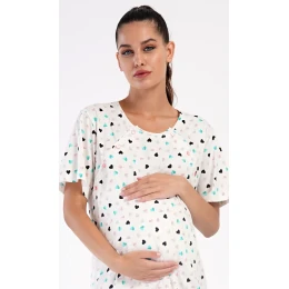 Dámska bavlnená tehotenská nočná košeľa Sara. Strih nočnej košele je určený na tehotenstvo, materstvo a dojčenie. Na dojčenie sú na bokoch košele rozparky, ktoré sa zapínajú na gombíky. Košeľa je potlačená malými srdiečkami. Použitý materiál so 100 % bavlnou je príjemný a pružný na dotyk.