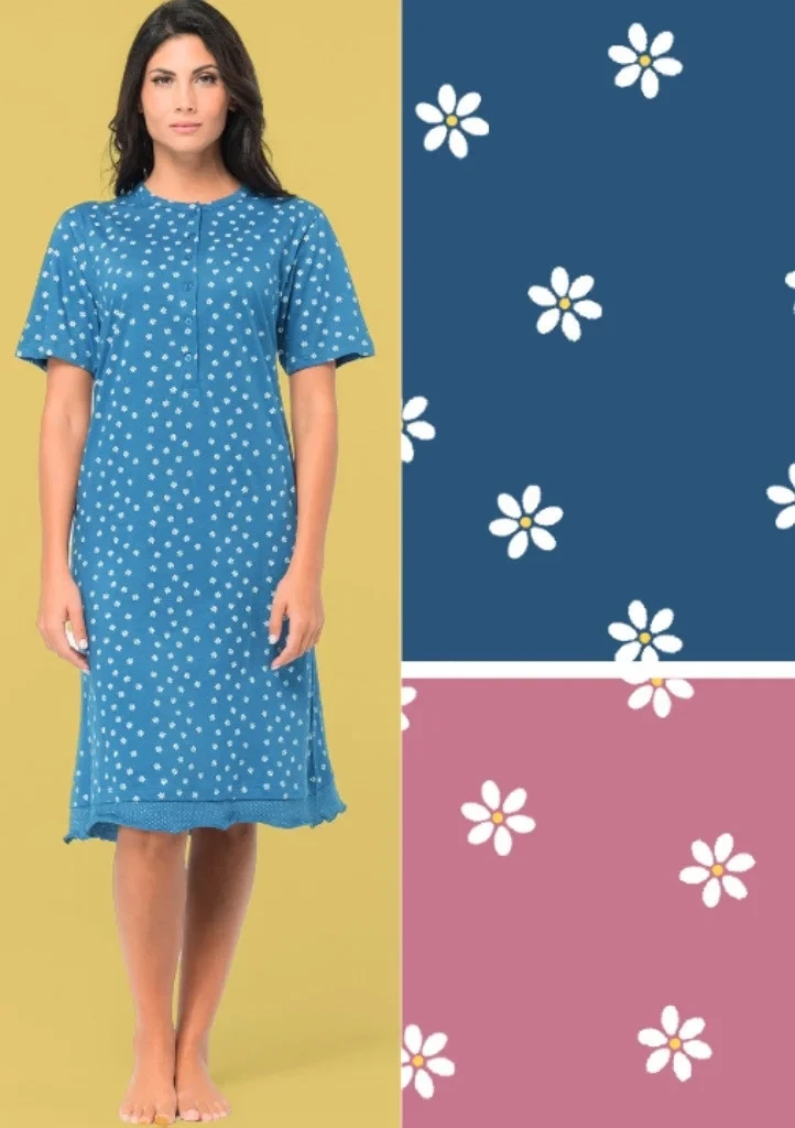 Dámská noční košile od značky Karelpiu. Noční košile s krátkým rukávem a hezkým motivem malých kytiček má kulatý dekolt a propínací légu na 5 knoflíků. Délka je po kolena a spodní okraj má našitý malý volánek. Je ušitá ze 100% bavlny a proto se v ní budete cítit velmi příjemně.