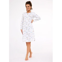Elegantní a pohodlná dámská noční košile z kvalitní 100% bavlny, vhodná i pro kojící maminky, je vyrobena z měkké vzorované bavlněné látky, která je příjemná na dotek a vhodná pro každodenní nošení během spánku. Košilka má výstřih se zapínáním na patentky. Délka košilky je nad kolena. Vhodná pro kojící matky díky snadnému rozepnutí v přední části. Vhodná jako domácí oděv nebo noční prádlo.