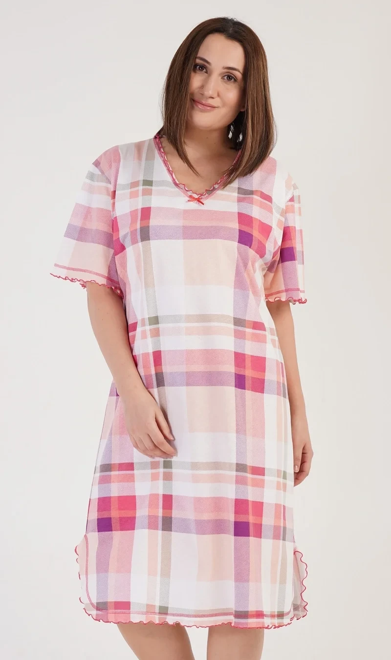 Dámska bavlnená nočná košeľa s krátkym rukávom Catherine. Nočná košeľa s pohodlnou dĺžkou pod kolená má ozdobné rebrovanie okolo výstrihu, rukávov a spodného okraja, ktorý je zvýraznený rozparkom. Látka trička je potlačená väčšou kockou v jahodovej a lososovej farbe. Použitý bavlnený materiál je príjemný a pružný na dotyk.