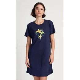 Dámska bavlnená nočná košeľa Paula s krátkymi rukávmi. Nočná košeľa s okrúhlym výstrihom a pohodlnou dĺžkou nad kolená má na hrudi obrázok exotických kvetov a malé nápisy. 100 % bavlnený materiál je príjemný a pružný na dotyk.